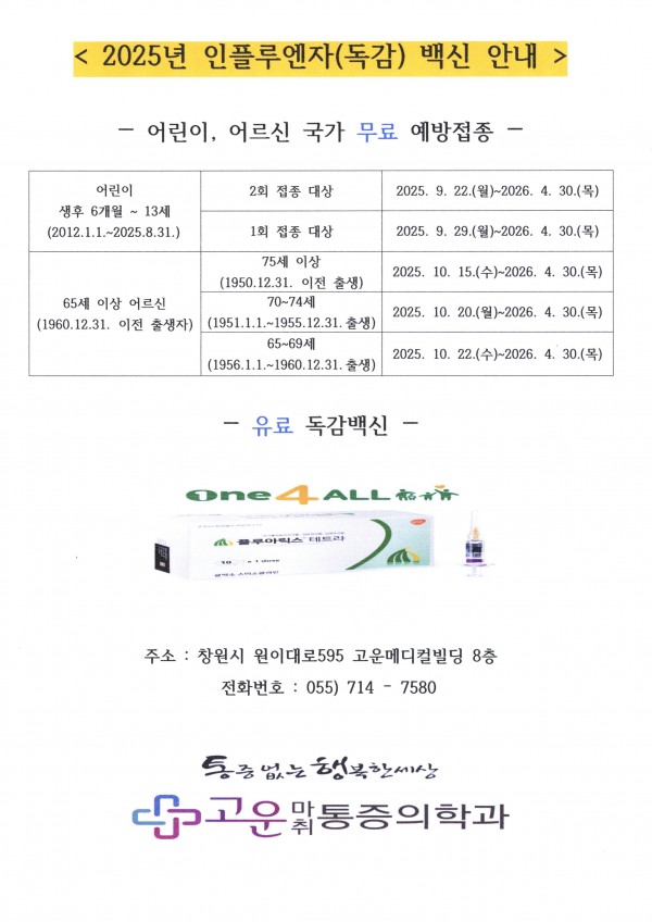 2025년 독감 접종 안내 페이지 정보 작성자 고운통증의학과 작성일25-09-20 11:16 조회93회 댓글0건 이전글 다음글 목록 본문 2025년 독감 접종을 시작합니다. -통증없는 세상을 꿈꿉니다- 댓글목록 등록된 댓글이 없습니다. 이전글 다음글 목록